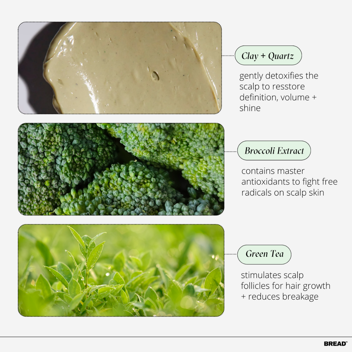 Ingredients: Water, Kaolin, Bentonite, Caprylic/Capric Triglyceride, Glyceryl Stearate SE, Glycerin, Cetearyl Alcohol, Cannabis Sativa (Hemp) Seed Oil, Camelina Sinensis (Matcha) Leaf Extract, Moroccan Lava Clay, Aloe Barbadensis (Aloe) Leaf Juice, Persea Gratissima (Avocado) Oil, Glutathione, Melia Azadirachta Leaf Extract, Melia Azadirachta Flower Extract, Brassica Oleracea Italica (Broccoli) Sprout Extract, Coffea Arabica (Coffee) Seed Extract, Cupressus Sempervirens Leaf/Stem Extract, Backhousia Anisata Leaf Extract, Helianthus Annuus (Sunflower) Seed Extract, Centella Asiatica Extract, Serenoa Serrulata Fruit Extract, Davidsonia Jerseyana Fruit Extract, Prunus Serrulata Flower Extract, Brassica Oleracea Italica (Broccoli) Extract, Palmaria Palmata Extract, Ananas Sativus (Pineapple) Fruit Extract, Phenoxyethanol, Ethylhexylglycerin
